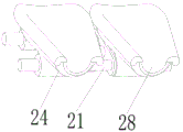 所述的膝盖推动装置2包括支撑架21、齿轮22、齿条23、膝座24,所述的支撑架21上设有齿轮轴25、两个限位轴26、限位板27,齿轮22通过轴承安装在齿轮轴25上,齿条23固定安装在滑槽11的底部,齿轮22与齿条23相啮合,两个限位轴26处于导向槽12内,两个膝座24分别安装在两根限位轴26的两端;限位轴26可以防止膝座24沿齿轮轴25转动,限位板27可以避免齿轮22与固定座1摩擦。The