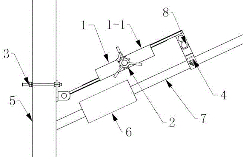 若替换为液压缸伸缩装置或电动伸缩杆,所述液压缸伸缩装置或电动伸缩杆的底部与底部夹紧装置3的侧板3-1铰接连接,液压缸伸缩装置或电动伸缩杆的顶部通过紧固螺栓与斜腕臂夹紧装置4的安装槽4-1固定连接;若替换为丝杆套管伸缩装置,所述丝杆套管伸缩装置包括套管,所述套管内部为螺纹结构,套管两端内部啮合螺纹旋向相反的丝杆,一丝杆端部与底部夹紧装置3的侧板3-1铰接连接,另一丝杆端部与斜腕臂夹紧装置4的固定槽4-1通过连接件8连接,转动套管能够实现丝杆的伸缩。If it is replaced with a hydraulic cylinder telescopic device or an electric telescopic rod, the bottom of the hydraulic cylinder telescopic device or the electric telescopic rod is hingedly connected with the side plate 3-1 of the