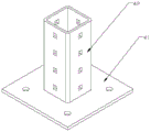 The bolt coupling holes of the first base plate 31 are rectangular in shape. The shapes of the bolt attachment holes of the cross member 2, the connecting plate 32, and the second bottom plate 41 are all circular. The shape of the bolt connecting hole of the upright post 1 and the shape of the bolt connecting hole of the connecting post 42 are both square.