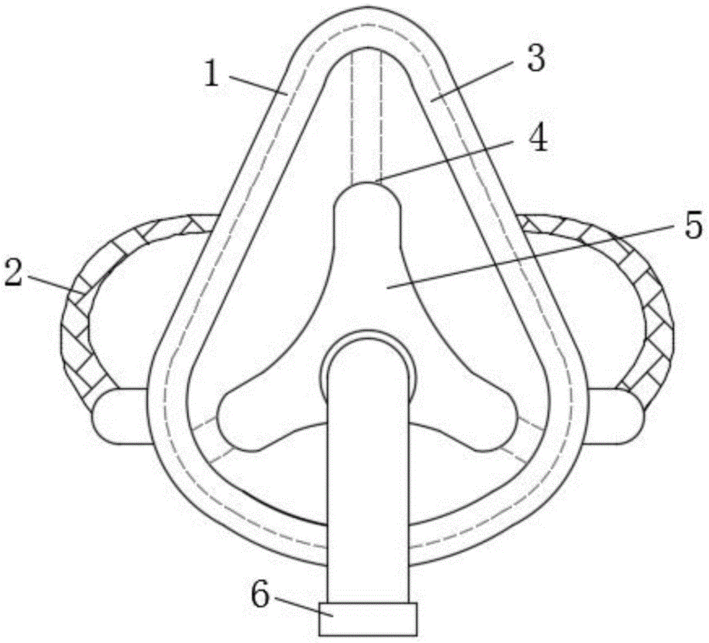 请参照图1、图2和图3所示,鼻翼垫9为三角形结构,且鼻翼垫9表面均匀设有多条吸水棉条11,鼻翼垫9共设有两个,且两个鼻翼垫9关于面罩本体1水平中线对称,鼻翼垫9能够贴合病人鼻翼,避免皮肤直接接触塑胶面罩,分气腔5为三角形结构,且三角形结构分气腔5的边均为弧形结构,分气腔5的棱角位置均设有连通管4,使得连通管4能够分多路导入分气腔5中,提高分散的均匀性,泄气孔10共设有多个,且多个泄气孔10均匀分布在泄气腔3表面,有利于提高面罩本体1的通气性,避免皮肤的硬性接触,固定件8共设有两个,且两个固定件8关于面罩本体1水平中线对称,两个固定件8之间缠绕连接有固定带2,连接管6通过分气腔5与导气口7连通,且连接管6端头与CPAP或双水平呼吸治疗仪连通,便于引入氧气实施供氧,面罩本体1边缘位置与泄气腔3处于同一高度,避免面罩本体1盖过泄气腔3,造成泄气腔3失去排气的作用,面罩本体1内表面为隆起的弧形面,使得面罩本体1能够贴合病人的面部皮肤,采用分气腔5和泄气腔3的氧气贯入方式,能够赋予面罩充气式的通透效果,也能够在供氧充足的情况下,当面罩本体1内部气体饱胀时,与外界空气的交替,避免面罩内部由于病人呼吸的湿气无法排泄的情况。Please refer to FIG. 1 , FIG. 2 and FIG. 3 , the