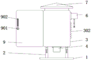 图中:1、底座;2、调节杆;201、主杆;202、固定螺栓;203、支杆;204、固定螺孔;3、配电箱主体;301、通风口;302、散热口;4、散热机构;401、通孔;402、FN10A-PG马达;403、扇叶;5、安装板;501、第二把手;502、防滑套;503、凹型滑板;6、S7-300PLC控制器;601、显示屏;602、旋钮;603、插头;7、防雨板;8、CWDZ11温度传感器;9、箱门;901、锁扣;902、第一把手。