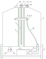 本实用新型的优点和有益效果在于:一种具有自清洗功能的精馏塔,其结构合理,可有效对精馏塔内部进行清洗,且清洗效果好。使用时,启动水泵运行,由水泵将清洗液存储箱内的清洗液抽入输水管中,清洗液流经软管后到达环形喷淋管,并通过设置在环形喷淋管上的喷嘴喷洒至塔体内壁,以对塔体内部进行清洗;并且,在清洗的过程中,可通过电机控制器控制升降驱动电机运行,由升降驱动电机通过传动皮带驱动丝杆转动,丝杆转动后将带动升降盘沿导向杆作升降运动,从而有利于对塔体内部进行全面清洗;完成清洗后,打开开关阀,由排污管将塔体内部的污水排出。另外,通过在输水管上设置加热器,可由加热器对流经输水管的清洗液进行加热,以满足清洗要求。The advantages and beneficial effects of the utility model are as follows: a rectification tower with self-cleaning function has a reasonable structure, can effectively clean the interior of the rectification tower, and has a good cleaning effect. When in use, start the water pump to run, the water pump will pump the cleaning fluid in the cleaning fluid storage tank into the water delivery pipe, the cleaning fluid will flow through the hose and then reach the annular spray pipe, and spray it to the annular spray pipe through the nozzle set on the annular spray pipe. The inner wall of the tower is used to clean the inside of the tower; and during the cleaning process, the motor controller can control the operation of the lift drive motor, and the lift drive motor drives the screw to rotate through the transmission belt. After the screw rotates, it will drive the lift. The disc moves up and down along the guide rod, which is conducive to the comprehensive cleaning of the inside of the tower body; after the cleaning is completed, the switch valve is opened, and the sewage inside the tower body is discharged by the sewage pipe. In addition, by arranging a heater on the water delivery pipe, the heater can heat the cleaning liquid flowing through the water delivery pipe to meet the cleaning requirements.