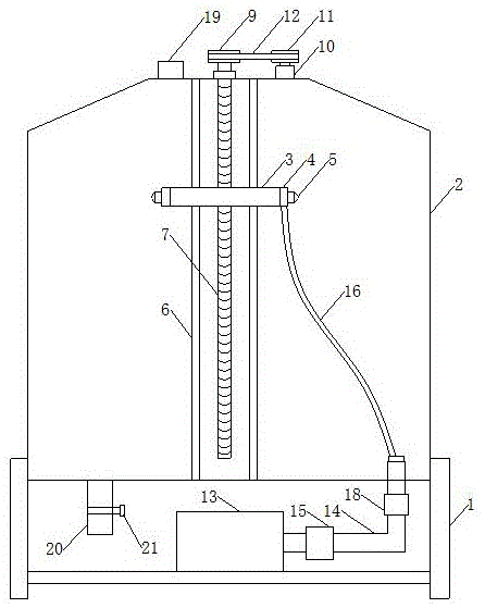 本实用新型的优点和有益效果在于:一种具有自清洗功能的精馏塔,其结构合理,可有效对精馏塔内部进行清洗,且清洗效果好。使用时,启动水泵15运行,由水泵15将清洗液存储箱13内的清洗液抽入输水管14中,清洗液流经软管16后到达环形喷淋管4,并通过设置在环形喷淋管4上的喷嘴5喷洒至塔体2内壁,以对塔体2内部进行清洗;并且,在清洗的过程中,可通过电机控制器19控制升降驱动电机10运行,由升降驱动电机10通过传动皮带12驱动丝杆7转动,丝杆7转动后将带动升降盘3沿导向杆6作升降运动,从而有利于对塔体2内部进行全面清洗;完成清洗后,打开开关阀21,由排污管20将塔体2内部的污水排出。另外,通过在输水管14上设置加热器18,可由加热器18对流经输水管14的清洗液进行加热,以满足清洗要求。The advantages and beneficial effects of the utility model are as follows: a rectification tower with self-cleaning function has a reasonable structure, can effectively clean the interior of the rectification tower, and has a good cleaning effect. When in use, the