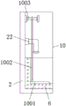 图中:1、地基;2、养殖舍体;3、排水渠;4、固定台;5、过滤板;6、料槽;7、供料室;8、电机;9、转轴;10、聚料机构;1001、活动底板;1002、抬升索;1003、收卷辊;11、通风窗;12、输送管;13、喷头;14、连接杆;15、露天放养区;16、门体;17、加料池;18、导料斜台;19、送料泵;20、紫外线杀菌灯;21、控制面板;22、送料管。In the picture: 1. Foundation; 2. Breeding house; 3. Drainage channel; 4. Fixed table; 5. Filter plate; 6. Feed trough; 7. Feeding room; 8. Motor; 9. Rotating shaft; 10. Poly Feeding mechanism; 1001, movable bottom plate; 1002, lifting cable; 1003, winding roller; 11, ventilation window; 12, conveying pipe; 13, spray head; 14, connecting rod; 15, outdoor stocking area; 16, door body; 17 , feeding pool; 18, guide ramp; 19, feeding pump; 20, ultraviolet germicidal lamp; 21, control panel; 22, feeding pipe.