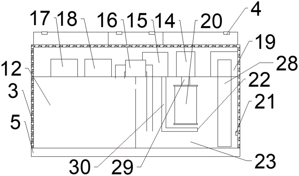 1、外壳;2、门板;3、保护层;4、转轴;5、底座;6、进水口;7、出水口;8、进风口;9、调节池;10、格栅;11、第一传感器;12、缺氧池;13、第一自吸泵;14、第二自吸泵;15、鼓风机;16、第三自吸泵;17、太阳能转换器;18、控制器;19、第四自吸泵;20、膜生物反应器;21、第二传感器;22、出气板;23、膜生物反应池;24、污泥池;25、消毒池;26、第一管道;27、第二管道;28、第三管道;29、第四管道;30、气管。1. Outer shell; 2. Door panel; 3. Protective layer; 4. Rotating shaft; 5. Base; 6. Water inlet; 7. Water outlet; 8. Air inlet; 9. Regulating pool; 10. Grille; 11. First Sensor; 12. Anoxic tank; 13. First self-priming pump; 14. Second self-priming pump; 15. Blower; 16. Third self-priming pump; 17. Solar energy converter; 18. Controller; Four self-priming pump; 20, membrane bioreactor; 21, second sensor; 22, gas outlet; 23, membrane bioreactor; 24, sludge tank; 25, disinfection tank; 26, first pipeline; 27, first The second pipe; 28, the third pipe; 29, the fourth pipe; 30, the trachea.