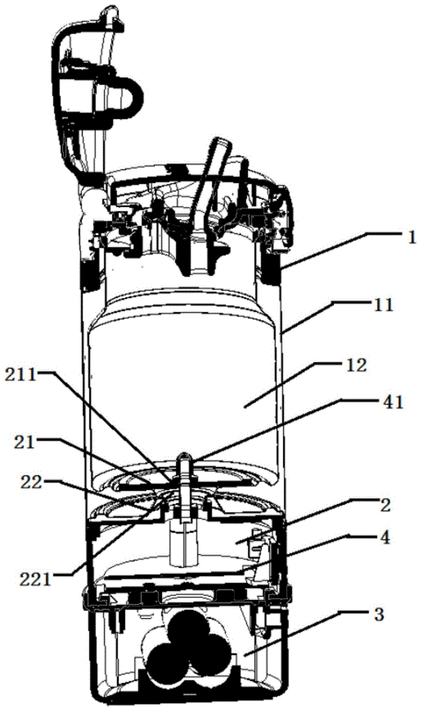 加热原理是:陶瓷加热盘22与加热控制模块4电性连接,因此加热控制模块4控制陶瓷加热盘22进行加热,然后陶瓷加热盘22将热量传给金属加热盘,由于金属加热盘21固定在内胆12的底部,使得金属加热盘将热量传给内胆12,从而对内胆里的水进行加热。外壁11采用304不锈钢材质。所述内胆12采用316不锈钢材质,且内胆12与外壁11之间抽真空,因此本实用新型保温效果好,不容易散热。The heating principle is: the ceramic heating plate 22 is electrically connected to the