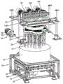 Compared with the prior art, the utility model obvious advantage and beneficial effect have, particularly, can know by above-mentioned technical scheme: through the arranged polishing module, the upper and lower displacement modules and the grinding material module, the first turntable, the second turntable and the fixed jig of the polishing module can drive the three to rotate through the polishing driving device, and the vibration device of the grinding material module vibrates the grinding material in the grinding material box; the workpiece to be polished simultaneously forms rotation and revolution, and relative displacement action in the vertical direction is formed between the workpiece to be polished and the fluid abrasive, so that the 3D grinding effect of the fluid abrasive is realized, the grinding efficiency and the polishing quality are greatly improved, and the efficiency is at least improved by more than 3.5 times compared with the common grinding efficiency;
