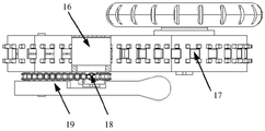 如图3所示,在本实用新型的一个具体实施例中,所述的腿式机构4包括腿式机构驱动电机16、第二链轮链条18、小腿19,所述的小腿19与摆臂铰接,铰接轴与从动履带轮的转轴同轴;腿式机构驱动电机16安装在履带机构3的摆臂上,腿式机构驱动电机16通过第二链轮链条18将动力传递给小腿19,实现小腿19绕铰接轴的旋转。在本实用新型的一个具体实施例中,所述的车轮9的转动和主动履带轮的转动轴为同一根轴,该轴中空,内部中空处套设有履带机构旋转轴8。As shown in FIG. 3 , in a specific embodiment of the present invention, the leg mechanism 4 includes a leg