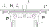 所述抓取机构12包括安装板13、底座15和夹块19,所述安装板13的底部转动安装有第二螺杆14,所述底座15固定安装于安装板13的底部,底座15与第二螺杆14转动连接,且底座15底部的左右两侧对称铰接安装有两个所述的夹块19;所述第二螺杆14位于底座15的左右两侧对称设置有两种旋向相反的外螺纹,第二螺杆14的左右两侧还对称螺纹连接有两个第二螺套17,第二螺套17的上侧与安装板13滑动连接,第二螺套17的下侧铰接安装有连接杆18,连接杆18的另一端与夹块19铰接,通过第二螺杆14的转动带动两个第二螺套17相向移动或背向移动,进而带动夹块19转动,两个夹块19相向转动时对金属废料进行夹持,带动金属废料移动;