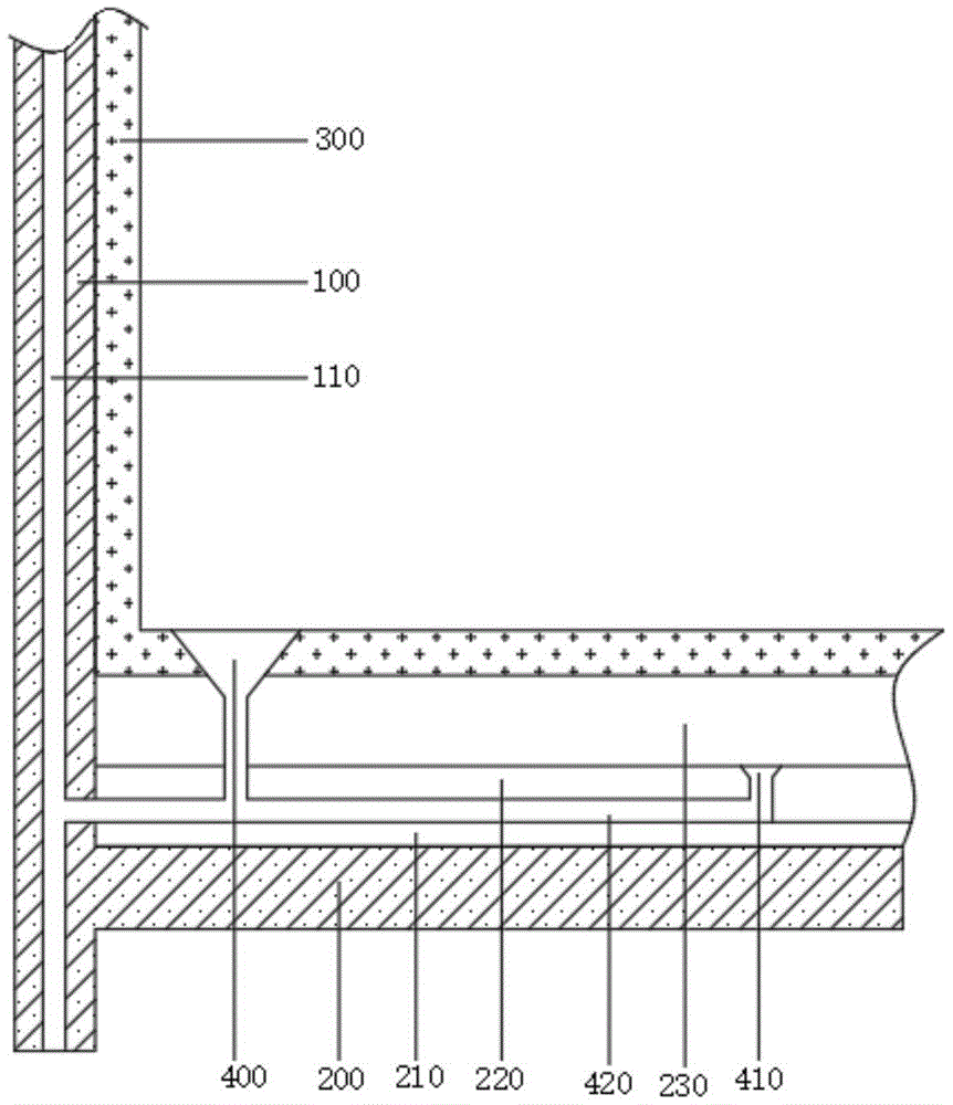 本实用新型提供如下技术方案:一种下沉式卫生间,在使用过程中,优化设计结构,提高防水效果,实现上下双层防水,请参阅图1,包括墙体100、楼板层200、表层防水层300和顶部地漏400;The utility model provides the following technical solutions: a sunken toilet, in the process of use, optimizes the design structure, improves the waterproof effect, and realizes the upper and lower double waterproofing, please refer to FIG.