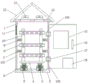 优选地,所述低压开关柜1前侧通过活页17连接有柜门104,所述柜门104上设置有透明窗口15、门把手16和工具柜18,其中可透明窗口观察开关柜内部情况,工具柜用于存放检修所用的工具。