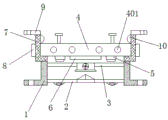 As shown in fig. 1-4, the utility model provides a technical solution: the utility model provides a cubical switchboard module link gear, includes casing 4 and wiring hole 401, wiring hole 401 has been seted up on 4 surfaces of casing, 4 lower surfaces of casing are fixedly connected with copper aluminum alloy fin 5 and semiconductor refrigeration piece 6 respectively, casing 4 is pegged graft at 7 inside and for dismantling the connection of ceramic seat, 7 inner walls of ceramic seat bond there is circular arc type block rubber 10, 7 bottom fixed connection landing legs of ceramic seat 1, landing leg 1 specifically is two, two from last respectively fixed connection connecting rod 3 and horizontal pole 2 down between the landing leg 1, 3 fixed surface of connecting rod connect heat dissipation fan 301, heat dissipation fan 301 lower surface can be dismantled and connect dustproof screen panel 302.