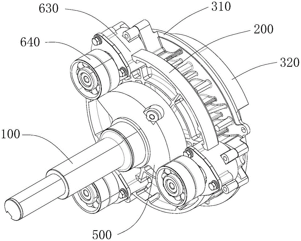 在动盘300绕静盘做公转平动时,偏心件610同时做相同偏心量的偏心转动,由于在压缩机工作时,动盘300受到气体轴向力、径向力以及切向力等的作用,使得作用于动盘300上的力出现了自转力矩,使得动盘300有自转的趋势,此时动盘300所受的切向力会被连接偏心件610的固定架所平衡,使得动盘300没法自转。When the moving