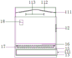 图例说明格式:幼崽看护箱1、幼崽检查区2、保温消毒罩11、查看窗12、积便抽屉13、翻门14、隔板15、擦拭组件16、支撑条17、温度测量仪18、铝吊顶111、电热管112、紫外线灯管113、把手131、外框151、铁丝网152、毛刷161、滑轨162、滑槽171、检测盆21和工具放置腔22。Legend description format: