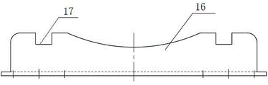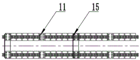 One end on the frame 4 is equipped with first driven sprocket 3, and the other end is equipped with second driven sprocket 5, and first driven sprocket 3 one side is arranged in outdoors, and second driven sprocket 5 one side is located indoorly, and second driven sprocket 5 below is equipped with speed reducer 8, and speed reducer sprocket 14 drives second driven sprocket 5 through drive chain 7, and second driven sprocket 5 both sides drive first driven sprocket 3 through chain 2. The first scraper 11 and the second scraper 15 are fixed on the two chains 2, and two ends of the second scraper 15 are respectively fixed on the two chains 2 to play a role in limiting. The top of scraper blade 2 is equipped with axle and axle sleeve structure and axle sleeve and is a little higher than scraper blade 1, and the friction of scraper blade and scraper blade chain bracket 9 when such design can reduce the chain and return makes the operation more smooth and noise reduction. The device is provided with two parallel chains 2. The chain scraper corresponding position on the frame 4 is provided with a chain scraper supporting groove 9, the chain scraper supporting groove 9 is a steel plate folding groove, the section is U-shaped, the number of the chain scraper supporting groove is two, the chain 2 is driven in the chain scraper supporting groove 9, and the chain tensioner 1 is arranged on one side of the first driven chain wheel 3. The chain tensioner 1 is of the prior art. 4 both sides welding of frame has fuel deflector 6, fuel deflector 6 is bent for the steel sheet and is made and have the gusset and consolidate, sets up about from frame center slant, and radian and material package outer circular arc are unanimous between two fuel deflectors 6 for control the material package and control the removal just to restrict the material package with the material package normal position, guarantee that the material package correctly impels. The chain 2 is equidistantly and uniformly provided with a first scraper 11 and a second scraper 15, the first scraper 11 is in the shape of an arc with the upper part protruding upwards, the arc deviates to one side, the two sides of the lower part are L-shaped, and the two sides are fixed on chain links of the chain through 4 screws. The second scraper 15 is shown in fig. 7-11, and the top of the scraper is provided with a shaft and a shaft sleeve, and the shaft sleeve is slightly higher than the highest point of the first scraper 11. The two ends of the scraper are respectively fixed on the two chains 2 through 4 screws, and the scraper plays a role in fixing. The top shaft and bushing of the second scraper 15 act to reduce the friction between the scraper and the scraper chain bracket 9, making the chain run smoother and reducing noise. Under the action of the self weight of the material bag, the first scraper 11 and the second scraper 15 are inserted into the material bag for conveying. One side of the second driven chain wheel 5 is provided with a travel switch assembly 10, and the structure of the travel switch assembly 10 is the prior art.