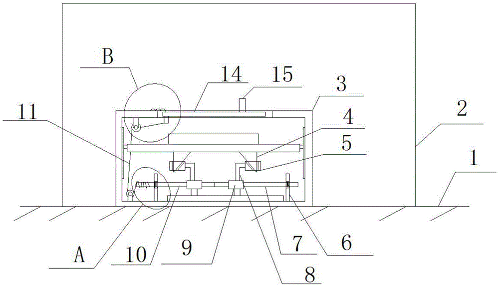 图中:1地面、2投影墙、3收纳箱、4升降块、5活动块、6竖杆、7第二丝杆、8L型连接杆、9丝杆导套、10第一丝杆、11拉绳、 12复位扭簧、13滑轮、14门板、15拉杆、16铰链、17固定块。In the picture: 1 ground, 2 projection wall, 3 storage box, 4 lifting block, 5 movable block, 6 vertical rod, 7 second screw rod, 8L-type connecting rod, 9 screw guide sleeve, 10 first screw rod, 11 Pull rope, 12 reset torsion spring, 13 pulley, 14 door panel, 15 pull rod, 16 hinge, 17 fixed block.