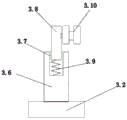 所述排缆组件3包括电动伸缩杆3.1、移动座3.2和对称设置在所述移动座3.2上的支撑板一3.3和支撑板二3.4,所述电动伸缩杆3.1设置在所述底座1上且所述电动伸缩杆3.1的输出端与所述移动座3.2连接,所述移动座3.2底部的两端设有导向块3.5且所述底座1上设有与两个所述导向块3.5分别滑动配合的导轨1.1,所述移动座3.2上设有升降座3.6,所述升降座3.6上设有凹槽3.7且所述凹槽3.7内滑动设有升降架3.8,所述升降架3.8的底部设有弹簧一3.9,所述弹簧一3.9远离所述升降架3.8的一端连接在所述凹槽3.7底部,所述升降架3.8的一侧转动连接有压缆轮3.10,所述支撑板一3.3和支撑板二3.4内侧均设有导轮3.12架3.11,所述导轮3.12架3.11上转动连接有导轮3.12,所述支撑板一3.3和支撑板二3.4上均设有电缆通孔3.13。