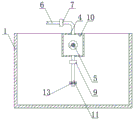 The working principle is as follows: during the use, open the discharge valve at disinfectant mixing chamber 4 top, carry required disinfectant in proportion to mixing chamber 4 through the water pump of installation on disinfectant addition pipe 8, when level sensor 10 senses the disinfectant and reaches the settlement water level, level sensor 10 signals PLC controller 12, PLC controller 12 received signal back control disinfectant adds the one-way solenoid valve 7 on the pipe and closes, control driving motor 3 simultaneously and rotate, driving motor 3 drives spiral stirring shaft 5 and rotates, make the disinfectant in disinfectant mixing chamber 4 fully stir, stir after the certain time, PLC controller 12 control driving motor 3 closes, the discharge valve of disinfectant mixing chamber 4 top is closed to the manual work simultaneously, then one-way solenoid valve 7 on the pipe accuse compressed air pipe 6 of PLC controller 12 opens, open solenoid valve 9 on discharging pipe 11 simultaneously, make the disinfectant in disinfectant mixing chamber 4 impress the disinfection pond 1 through the pressure differential that compressed air produced In, after the disinfectant in the disinfectant mixing bin 4 is all pressed into the disinfection pond 1, continue to let in compressed air and make the disinfectant in the disinfection pond 1 fully diffuse, reach the disinfection requirement until detecting the quality of water in the disinfection pond 1, close solenoid valve 7 on the compressed air pipe 6 and the solenoid valve 9 on the discharging pipe 11, the disinfection process of this moment is accomplished.