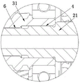 As shown in fig. 6, which is a schematic view after the motor shaft and the reducer are connected, when the motor shaft 21 and the reducer shaft 31 rotate in the rotation direction n of the motor shaft 21 when the electric vehicle advances, the lubricating oil enters the outer spiral groove 51 and/or the inner spiral groove 52 from the gap between the motor shaft 21 and the reducer shaft 31, and is supplied to the spline 6 by the chip removal effect similar to that of a drill generated when the motor shaft 21 rotates, and is finally discharged through the central through hole of the reducer shaft 31 after the spline 6 is lubricated and cooled. During the rotation of the motor shaft 21, the lubricating oil continuously passes through the above-described path to form a flow of lubricating oil, the flow direction of which is shown as L in fig. 6.