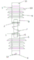 在本实施例中,调节距离的装置由调节螺母、调节螺钉6、弹簧7组成,弹簧7缠绕设置在调节螺钉6的外部,调节螺母设置有两个,分为调节螺母一2和调节螺母二3,调节螺母一2连接陶瓷芯棒一8的底部,调节螺母二3连接陶瓷芯棒二5的上方。通过旋拧调节螺母,压缩弹簧7,从而使绝缘子本体1的长度产生变化。
