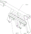 在斜滚轮架806上安装有向外端岔开的斜滚轮808,在每一对斜滚轮的后方水平安装有辅助滚轮809,直轮滚架807上对应水平安装有直滚轮810,在斜滚轮架与直滚轮架分别向靠近导杆的方向摆动时,斜滚轮808、以及辅助滚轮809和直滚轮810分别能够沿导杆的表面滚动,从而滚动到正确的位置,从而两个斜滚轮、以及辅助滚轮和直滚轮共同将导杆包围并夹持,实现叉形扶正。工作时扶正升降油缸推动扶正机构将导杆扶正,然后升降机构推动扶正机构上移将导杆顶部扶正到标准位。该机构采用叉型扶正,扶正点从导杆下部开始,并且扶正机构能够上下移动,导杆扶正的范围更加广泛,扶正的位置更加标准,使导杆组装站过程更加顺畅,极大的提高了阳极组装站的组装效率。