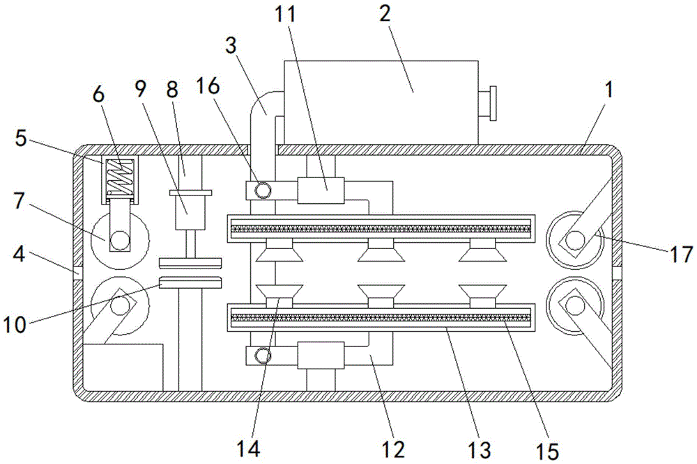 Referring to fig. 1, a high-efficiency drying device for textile fabric comprises a main body box 1, a heating fan 2 is fixedly connected to the top of the main body box 1, an air inlet pipe is fixedly connected to the heating fan 2, a dust cover is fixedly connected to the opening of the air inlet pipe, a connecting pipe 3 is fixedly connected to the left side of the heating fan 2, through holes 4 are formed in the left side and the right side of the main body box 1, a fixing pipe 5 is fixedly connected to the inner top wall of the main body box 1, a snap ring is fixedly connected to the inner wall of the fixing pipe 5, the snap ring is located at the opening of the fixing pipe 5, a spring 6 is fixedly connected to the inner wall of the fixing pipe 5, a compression roller 7 is fixedly connected to the bottom of the spring 6 and the left side inner wall of the main body box 1, connecting rods 8 are fixedly connected to the inner top wall and the inner bottom wall of the main body, the outer surface of the pressing plate 10 is fixedly connected with a water absorption layer, the inner wall of the water absorption layer is filled with water absorption resin, the inner top wall and the inner bottom wall of the main box 1 are both fixedly connected with stabilizing components 11, each stabilizing component 11 consists of a hoop and a supporting rod, the bottom end of each supporting rod is fixedly connected with the hoop, the connecting angle between the top end of each supporting rod and the inner wall of the main box is ninety degrees, the inner walls of the two stabilizing components 11 are both movably connected with through pipes 12, one opposite sides of the two through pipes 12 are both fixedly connected with connecting plates 13, one opposite sides of the two connecting plates 13 are both fixedly connected with spray heads 14, heating wires 15 are both fixedly connected inside the two connecting plates 13, the back sides of the through pipes 12 are fixedly connected with vent pipes 16, the back sides of the vent pipes 16 are communicated with connecting pipes 3, the inner wall of the right side of the main, the outer surface of the material guide roller 17 is provided with heat-conducting ceramic.