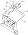 The cutting mechanism of the embodiment comprises a cutting table 2-1, a cutting grinding wheel 2-3 and a motor, wherein a cutting passage 2-2 is arranged on the table surface of the cutting table 2-1, the cutting grinding wheel 2-3 can partially penetrate through the cutting passage 2-2, and the cutting grinding wheel 2-3 is driven by the motor to rotate at a high speed, specifically, a rotating shaft 2-12 is arranged at the center of the cutting grinding wheel 2-3, and the rotating shaft 2-12 is in transmission connection with an output shaft of the motor through a transmission belt (not shown in the transmission belt diagram but clearly understood by those skilled in the art). The cutting grinding wheel 2-3 and the motor are arranged on the movable supporting seat 2-13, and the movable supporting seat 2-13 is driven by the translation driving device to translate. In order to move the movable supporting seats 2-13 more stably, the movable supporting seats 2-13 are arranged on the cutting supports 2-16 through guide rails 2-15, specifically, the bases of the movable supporting seats 2-13 are fixedly connected with sliding blocks, the guide rails are arranged on the cutting supports 2-16, and the sliding blocks are arranged on the guide rails in a sliding mode. Meanwhile, the translation driving device of the embodiment is the air cylinders 2-14, and the air cylinders 2-14 act quickly and efficiently. It should be noted that the translation driving device is also an electric screw rod, and the speed of the electric screw rod is not higher than that of the air cylinders 2-14, but the operation is more stable and the precision is high.