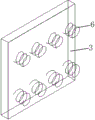 The sphere 5 is rough in surface, the same second damping 7 is arranged between the outer wall of the sphere and the six inner walls of the inner cavity of the hollow cube 4, the sphere 5 with the rough surface is arranged on the inner side of the hollow cube 4, and the spring damping is arranged on the sphere 5 in front, back, left, right, up and down and is connected with the inner walls of the inner side of the hollow cube 4, so that the sphere 5 can be suspended in the hollow inner cavity, seismic energy can be absorbed through compression and stretching of the second damping 7, and transverse and longitudinal displacement can be buffered.