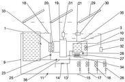 图1—4中,1—储能水箱,2—集热器,3—保温水箱,4—循环管路一,5—循环管路二,6—水泵,7—自来水管路一,8—阀门一,9—输水管路,10—用水管路,11—增压泵一,12—阀门二,13—自来水管路二,14—阀门三,15—暖气管路一,16—风扇换热器,17—支流冷热水循环管路,18—第一热量转移管路,19—热泵,20—冷端管路,21—热端管路,22—散热器,23—循环泵一,24—单向阀,25—增压泵二,26—阀门四,27—第二热量转移管路,28—循环泵二,29—太阳能发电板,30—蓄电池,31—交直流转换器,32—充电桩,33—热量交换器一,34—热量交换器二,35—用电线路,36—暖气管路二。