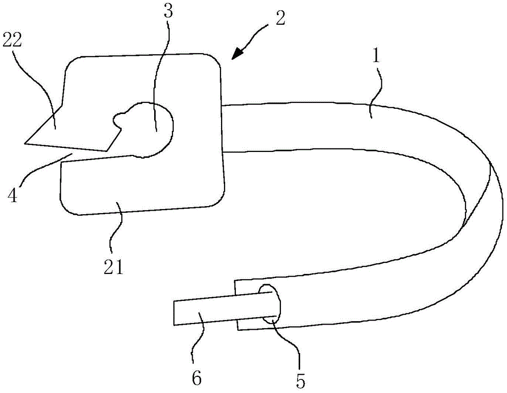 Preferably, in order to fix the position of dressing pad 2 more firmly, the utility model provides a be used for the sheathed tube dressing of tracheotomy still includes fixed band 6, is equipped with installation position 5 in the extension pad 1, and fixed band 6 detachably installs in installation position 5, and the head and the tail both ends of fixed band 6 all stand out outside installation position 5, and the head and the tail both ends detachably of fixed band 6 link together. After the connecting pad 22 is pressed on the pad body 21 and the extension pad 1, the whole dressing has the possibility of sliding off, therefore, an installation position 5 for the fixing band 6 to pass through is arranged in the extension pad 1, the middle part of the fixing band 6 is positioned in the installation position 5 and connected with the extension pad 1, and the head end and the tail end of the fixing band 6 protrude out of the installation position 5 and are positioned on the outer side of the dressing pad 2. When the position of the dressing pad 2 needs to be fixed, the head end and the tail end of the fixing band 6 penetrate through the two through holes on the fixing wing of the tracheotomy sleeve tube, and the two ends of the fixing band 6 are knotted, so that the pad body 21, the connecting pad 22 and the extension pad 1 are connected and fastened, the tracheotomy sleeve tube is pressed on the dressing pad 2, and the dressing pad 2 is not easy to loosen. The mounting locations 5 are channels provided in the extension mat 1, the inlet ends of the channels being located at the first end of the extension mat 1 and the outlet ends of the channels being located at the second end of the extension mat 1. The channel extends along the length direction of the extension pad 1, and when the extension pad 1 is arranged in a circular shape, the channel is positioned at the outer side of the extension pad 1. The second end of the fixing strip 6 passes through the inlet end into the channel and then out of the outlet end, i.e. the second end of the extension mat 1, at this time, the first end of the fixing strip 6 is located at the inlet end, i.e. the position of the first end of the extension mat 1, and the fixing strip 6 penetrates through the whole extension mat 1 to realize that it is detachably connected with the extension mat 1. Connect the first end and the second end of fixed band 6, specifically can be for tying up fixed band 6, after passing two through-holes on the sheathed tube stationary vane of tracheotomy with the both ends of fixed band 6, tie a knot the both ends of fixed band 6 to compress tightly the second end of extension pad 1 in dressing pad 2 top, realize fixing the effect at patient's neck with this a dressing that is used for the sheathed tube trachea incision. In the embodiment, the fixing belt 6 is a cloth belt, and may be a cotton braid.