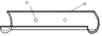图3是弧形槽的结构示意图、图4 是适配件的结构的结构示意图、图5是适配件的端面结构示意图、所述固定卡12与滑动卡11垂直延伸至滑动卡10的相同侧,固定卡12与滑动卡11端部距离滑动尺10的长度在10-20cm,弧形槽一14a、弧形槽二14b或适配件20的端面与长度方向个垂直。所述穿刺定位固定件固定在固定卡12和滑动卡11端部,弧形槽轴心与滑动尺10长边平行,穿刺定位固定件包括弧形槽包括弧形槽一14a和弧形槽二14b,弧形槽一14a和弧形槽二14b分别焊接固定在滑动卡11和固定卡12的端部,两个弧形槽的轴心与滑动尺10长边平行,滑动卡10上弧形槽一14a配套的适配件20设置在弧形槽一14a内,与固定卡12相对的滑动卡11上弧形槽一14a端部设置有垂直于弧形槽一14a轴心的环形片定位片27,环形片定位片27的内周与弧形槽一14a内周吻合,环形定位片27上朝向滑动尺10的一方开设有引流管与定位尺的分离开口28,分离开口28内端为圆弧形,圆弧半径大小与弧形槽一14a的内径相等,圆弧为中心孔的一部分。