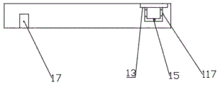 Specifically, in this device, utmost point post groove 12 sets up in a side edge of case lid body 1, and utmost point post groove 12 symmetry sets up to 2 and is anodal groove and negative pole groove respectively, the liquid feeding hole sets up the opposite side at case lid body 1. In order to seal the pole column groove well, a pole column groove upper platform 13 is arranged around the pole column groove 12 and is arranged at the upper part of the pole column groove 2, so that a step groove is formed on the box cover body 1, a pole column hole 14 is arranged at the center of the pole column groove 12 and penetrates through the pole column groove 12, a pole column penetrates out of the pole column hole, the pole column hole 14 is in a shape matched with the pole column of the battery, the pole column hole can be preferably arranged in a close contact mode, and a sealing piece can be arranged between the pole column groove upper platform and the pole column groove to seal when necessary. The fixed edge that sets up at case lid body 1 of utmost point post groove curb plate 15 covers half of utmost point post groove 12 degree of depth for the hole has been opened to the side of utmost point post groove 12, utmost point post groove side board platform 117 sets up the utmost point post groove 12 opening part in utmost point post groove side 15 top, utmost point post groove screw 16 sets up on utmost point post groove upper mounting 13 and utmost point post groove side board platform 117, utmost point post groove cover 120 sets up to the L shape structure with utmost point post groove 12 looks adaptation and inlays the setting in utmost point post groove upper mounting 13 and utmost point post groove side board platform 117, the electric wire that is provided with rubber parcel is connected on utmost point post groove cover 120, and electric wire one end is connected on the battery utmost point post, so, when the equipment uses, with the electric wire connection on utmost point post groove cover 120 back on the battery utmost point post, use the screw to cover 120 covers on utmost point post groove 12 is whole sealed. The case cover side screw holes 17 are formed in the longer two sides of the case cover body 1 and used for connecting the whole case cover to the case body. Specifically, the second connecting platform 121 is arranged on the inner side of the box cover side screw hole 17, the box cover body 1 is covered on the battery box body 2, the first connecting platform 21 and the second connecting platform 121 are matched with each other, and the second connecting platform 121 and the first connecting platform 21 are covered and arranged to be fixedly connected through screws between the box cover side screw hole 17 and the side screw column 22. This enables a completely tight fastening of the box.