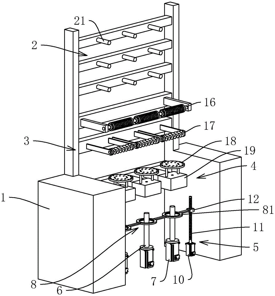 In the figure, 1, a frame; 2. a pay-off mechanism; 21. a wire releasing rod; 3. a wire guide mechanism; 4. a twisting mechanism; 5. a winding mechanism; 6. fixing the rod; 7. a drive motor; 8. a support frame; 81. a connecting ring; 9. threading a yarn ring; 10. a drive motor; 11. a screw rod; 12. a slider; 13. a guide bar; 15. a ring groove; 16. a wire guide shaft 17, a wire guide rod; 18. wire coils; 19. a twisting spindle.