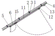 其中:1为光伏电池组件、2为压块、3为檩条、4为钢梁、5为梁柱连接件A、6为前支柱、7为前支托、8为底座、9为拖吊环、10为后支托、11为后支柱、12为梁柱连接件B、13为平放连接件、14为支撑、15为支柱收拢连接件、1501为螺栓孔A、1502为螺栓孔B。