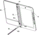 其中,11为左书板,111为收纳槽,12为右书板,121为笔槽,122为便签槽,123为盖板,124为卡扣,13为合页,141为托书板,142为托板槽,143为压书弹簧,21为液晶写字板,22为液晶写字笔,3为调节架,31为支撑架,311为卡位块,32为承托架,321为卡位槽。