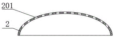 the buffer plate 2 is arranged at the upper part of the buffer chamber 3 and below the liquid inlet pipe, the buffer plate 2 is a spherical curved plate, the outer edge of the spherical curved plate is fixedly connected with the inner wall of the buffer chamber 3, small holes 201 are uniformly distributed on the convex surface of the spherical curved plate, sewage is pumped into the buffer chamber 3 through the liquid inlet pipe, and the buffer plate 2 can buffer water flow to reduce the water flow speed;