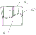 As shown in fig. 3, the upper die 1 is provided with a forming punch 5, and the lower die 2 is provided with a forming cover 6. As shown in fig. 8, the forming cover 6 includes a lower turning part 61 and an upper pressing part 62, a shaft hole 63 is formed between the turning part 61 and the pressing part 62, a latch 7 is connected to the lower mold 2 through the shaft hole 63, and the forming cover 6 is rotatable around the latch 7 inserted into the shaft hole 63. Pressing portion 62 includes a shaping face 621, a first drive face 622, and a second drive face 623, where shaping face 621, first drive face 622, and second drive face 623 are all planar, and first drive face 622 and second drive face 623 are in smooth transition communication. As shown in fig. 7, the forming punch 5 includes a third driving surface 51 and a fourth driving surface 52, and the third driving surface 51 and the fourth driving surface 52 are both planar and are connected in smooth transition. When the upper die 1 moves towards the lower die 2, the third driving surface 51 abuts against the first driving surface 622 and drives the forming cover plate 6 to rotate, so that the shaping surface 621 abuts against the inclined surface 42 of the fixed steel block 4, and the material sheet side surface 32 is pressed inwards; as the upper die 1 continues to move downwards, the third driving surface 51 slides past the first driving surface 622, the fourth driving surface 52 abuts against the second driving surface 623, the forming cover 6 is kept stationary, and the shaping surface 621 abuts against the inclined surface 42 and continuously presses the web side surface 32.