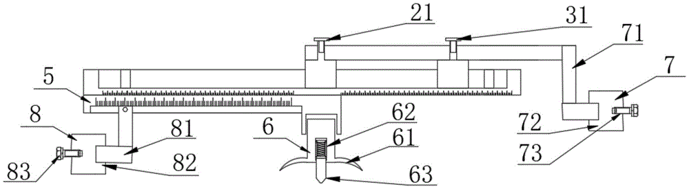 In the figure: the pen comprises a ruler 1, a first sliding block 2, a first piston 21, a first screw 22-detached screw, a second sliding block 3, a second piston 31, a second screw 32-detached screw, a cross groove 4, a fixed block 41, a fixed screw 42, a linear groove 5, a fixed device 6, a circular sucker 61, a small spring 62, a conical head 63, a pen 7-clamping mechanism I, a first 71L-shaped rod 72, a first 73 adjusting screw, a second 8-clamping mechanism, a second 81L-shaped rod 82, a second 83 adjusting screw.