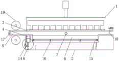 in the figure: the device comprises an upper pressing part 1, a lower pressing part 2, an extrusion strip 3, a pressure bearing plate 4, a guide inlet 5, a pressing bin 6, an injection port 7, a lifting rod 8, a scale column 9, a rack 10, a support transverse pipe 11, a traction spring 12, a limiting rod 13, a gear 14, a conveyor belt 15, a lifting column 16, a separating part 17, a knife switch 18 and a bag winding wheel 19.
