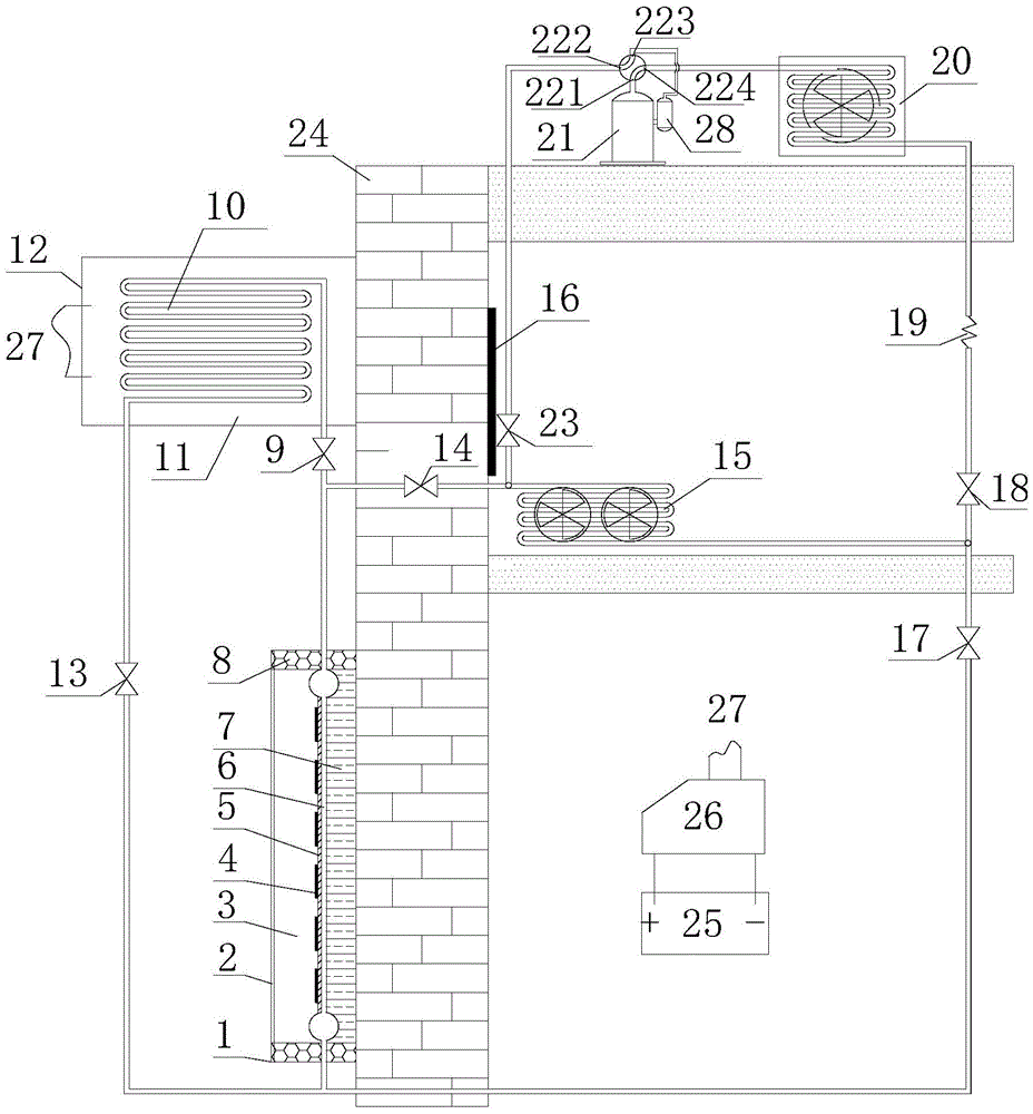 in the figure, 1 is a heat pipe type photovoltaic and thermal module, 2 is a glass plate, 3 is a heat insulation air layer, 4 is a solar cell array, 5 is a heat absorption plate, 6 is a microchannel heat pipe evaporator, 7 is a heat insulation layer, 8 is a photovoltaic and thermal module frame, 9 is a water-cooled heat exchanger inlet valve, 10 is a water-cooled condenser, 11 is a heat insulation water tank, 12 is a water-cooled heat exchanger, 13 is a water-cooled heat exchanger outlet valve, 14 is an indoor air-cooled heat exchanger-heat pipe side inlet valve, 15 is an indoor air-cooled heat exchanger, 16 is a phase change heat storage material layer, 17 is an indoor air-cooled heat exchanger-heat pipe side outlet valve, 18 is an indoor air-cooled heat exchanger-heat pump side outlet valve, 19 is a capillary tube, 20 is an outdoor air-cooled heat exchanger, 21 is a compressor, 22 is a four-way reversing valve, 221 is a first interface, 222 is a second interface, 23 is an indoor air-cooled heat exchanger-heat pump side inlet valve, 24 is a wall body, 25 is a solar storage battery, 26 is a solar inversion system, 27 is a user end, and 28 is a gas-liquid separator.