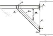 1. A novel assembled digital-to-analog steel structure bracket is characterized in that; the assembled bracket structure is provided with a beam I-shaped steel (1), an inclined strut I-shaped steel (2), a connecting plate (3), a vertical stiffening plate (4), a connecting plate stiffening plate (5), a connecting plate base (6), a bolt (7), an embedded climbing cone (8) and a steel belt connecting assembly (11); crossbeam I-steel (1) and vertical stiffener (4) form wholly, correspond the position about in concrete (10) structure and set up pre-buried awl (8) of climbing respectively, the tip of crossbeam I-steel (1) is fixed with the pre-buried awl (8) of climbing of upper end through web base (6), the one end of bracing I-steel (2) is passed through web (3) and is connected with crossbeam I-steel (1), the lower extreme of bracing I-steel (2) is passed through web base (6) and is connected with the pre-buried awl (8) of climbing of lower extreme, still be provided with steel band coupling assembling (11) between bracing I-steel (2) and crossbeam I-steel (1).