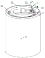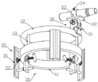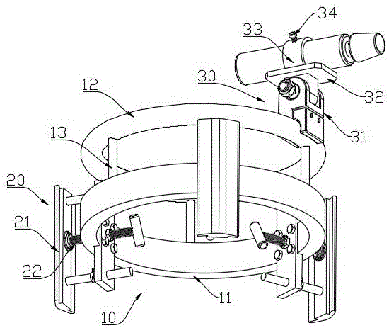 Specifically, the positioning component 10 includes a circular ring 11, and at least three groups of pressing mechanisms 20 are uniformly arranged on the circular ring 11 along the circumference. The upper side of the circular ring 11 is provided with a track 12 in parallel, the track 12 is in a circular ring structure, and the section of the track is circular. More specifically, the track 12 is connected with the ring 11 through a plurality of cylinders 14, and the plurality of cylinders 14 are uniformly arranged along the circumference of the ring 11.