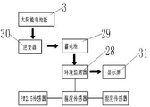 Further, be electric connection between solar cell panel 3 and the inverter 30, all be electric connection between battery 29 and inverter 30 and the environment monitor 28, and environment monitor 28 transmits the signal of telecommunication for display screen 31 through the controller, environment monitor 28 includes PM2.5 sensor, temperature sensor and humidity transducer, battery 29 supplies power for environment monitor 28, PM2.5 sensor, the environmental information feedback of monitoring is to environment monitor 28 by temperature sensor and humidity transducer, environment monitor 28 transmits the signal of telecommunication to display screen 31 through the controller.