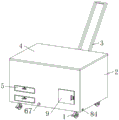 图例说明格式:移动轮1、箱体2、伸缩拉杆3、第一箱盖4、储物抽屉5、检测机构6、电动推杆61、蓄电池62、第一软管63、下料口64、检测台65、收集箱66、出水口67、输液机构7、液体箱71、潜水泵72、第一钢管73、第二软管74、控制阀75、洒水枪76、第二钢管77、第三软管78、三通连接件79、消毒机构8、消毒箱81、玻璃板82、紫外杀菌灯83、排水口84、储水盒85、喷头86、第二箱盖87、过滤网88和箱门9。