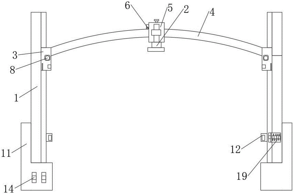 In the figure: the device comprises an upright post 1, a lighting lamp 2, a sliding block 3, an arc-shaped track 4, a supporting block 5, a first motor 6, a roller 7, a second motor 8, a gear 9, a rack plate 10, a base 11, a bolt rod 12, a bolt hole 13, a reversing switch 14, a handle bolt 15, a bolt rod 16, an electromagnet 17, a spring 18 and a tension spring 19.