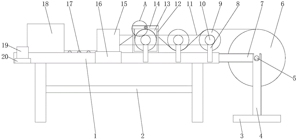 Preferably, the bottom fixed mounting of frame has the main tributary supporting leg, one side fixed mounting of frame has the link, the one end fixedly connected with auxiliary supporting leg of frame is kept away from to the link, the inside swing joint of auxiliary supporting leg one end has the paper spool, the outer wall of paper spool is provided with the paper roll cover, the bottom fixed mounting of auxiliary supporting leg has the support base.