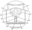 请参阅图4,榨汁机构5包括引流罩51、连接柱52、支撑架53、第二驱动电机54、凸轮55、滑轮座56、推杆57、伸缩弹簧58、连接板59、榨汁板510和榨汁齿511,第二驱动电机54驱动凸轮55旋转,凸轮55在旋转的过程中,不断的推动滑轮座56和推杆57上下运动进而使榨汁板510和榨汁齿511同步上下运动并挤压落至在滤板3上的甘蔗,此时甘蔗汁通过滤孔32流至果汁仓13内,通过出料口131排至盛放杯6内,通过粉碎刀片411先对甘蔗进行初步粉碎,通过榨汁机构5再对甘蔗进行榨汁,整个甘蔗榨汁的过程中,不需要人工操作,其省时省力,榨汁效果好且榨汁效率高,引流罩51通过连接柱52安装在引流板2上,引流罩51的横向最大长度大于引流槽21的横向槽口长度,甘蔗初步粉碎后,在引流板2的引流作用下通过引流槽21而进入榨汁仓12内并落至在滤板3上,引流罩51的内侧设置有第二驱动电机54,第二驱动电机54通过支撑架53安装在引流罩51上,第二驱动电机54的输出轴通过花键安装有凸轮55,凸轮55与滑轮座56高副连接,滑轮座56通过伸缩弹簧58与连接板59连接,连接板59固定在引流罩51上,滑轮座56上还安装有推杆57,推杆57的下端穿过连接板59延伸至连接板59的下方连接有榨汁板510,榨汁板510的尺寸与滤板3上开设滤孔32的水平面的尺寸相同,可保证榨汁齿511充分挤压落至在滤板3上的甘蔗,榨汁板510上均匀分布有榨汁齿511。