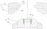 Further, a clamping ring groove 612 is formed in the lower surface of the first upper mold core 61; the upper surface of the second upper mold core 62 is convexly provided with an annular positioning boss 621 matched with the clamping ring groove 612; the second upper mold core 62 is clamped with the clamping ring groove 612 of the first upper mold core 61 through a positioning boss 621.