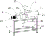 the extrusion power mechanism 2 comprises a motor 21, a speed reducer 22, a double-shaft power box 23 and a double-shaft extrusion box 24, wherein the power output end of the motor 21 is connected with the speed reducer 22, the power output end of the speed reducer 22 is connected with the double-shaft power box 23, the power output end of the double-shaft power box 23 is connected with the double-shaft extrusion box 24, and the feeding end of the double-shaft extrusion box 24 is provided with a blanking funnel 25;