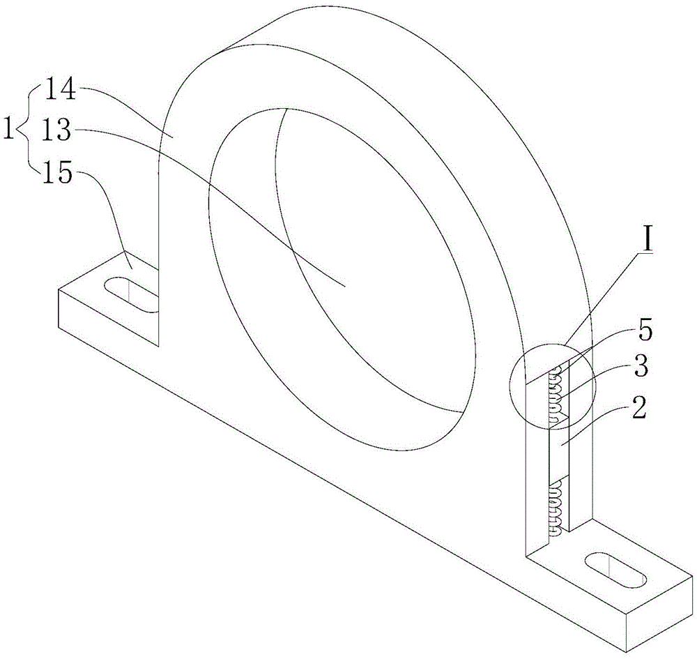 As a specific embodiment of the bearing bush vibration isolating device provided in the present invention, please refer to fig. 6, the base 1 includes a supporting body 14 and a fixing block 15, the second groove 12 is disposed at the bottom of the supporting body 14, the through hole 13 is disposed on the supporting body 14, and the first grooves 11 are disposed at two sides of the supporting body 14; the fixed blocks 15 are two, the two fixed blocks 15 are respectively and fixedly arranged on two sides of the bearing body 14, and the first groove 11 extends to the surface of the fixed blocks 15. The base 1 is arranged into two parts, processing and manufacturing are facilitated, and the two fixing blocks 15 are connected to the two sides of the bearing body 14 in a welding mode.